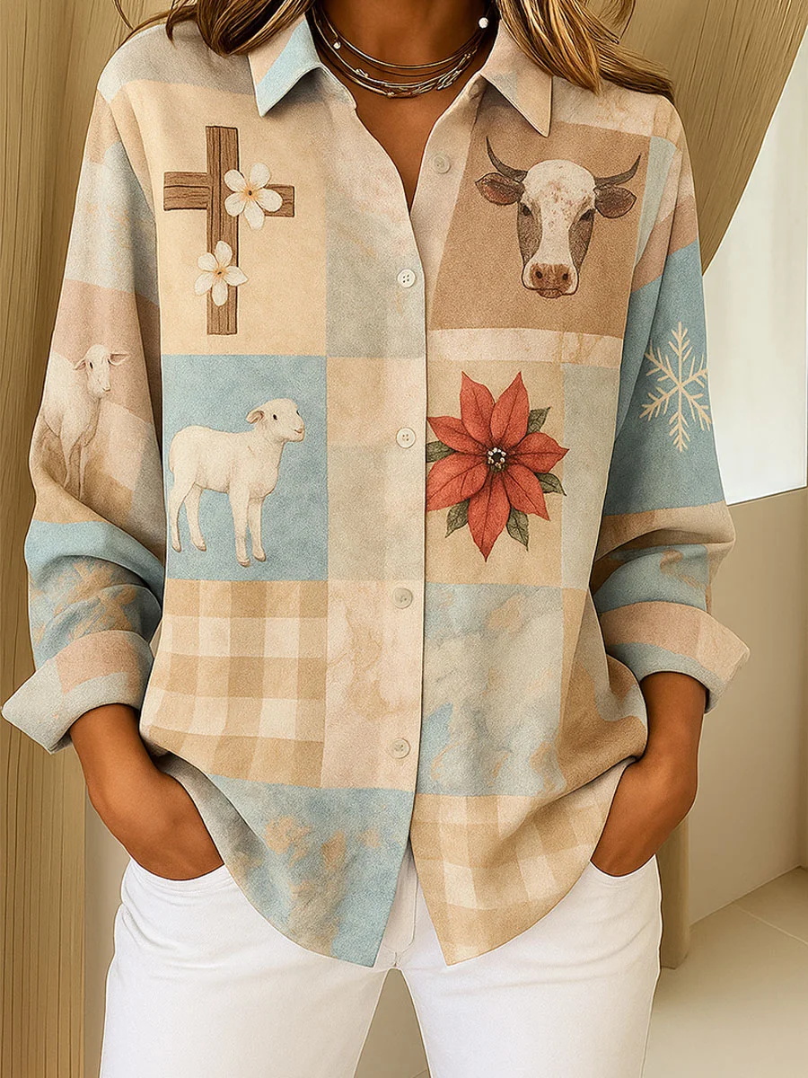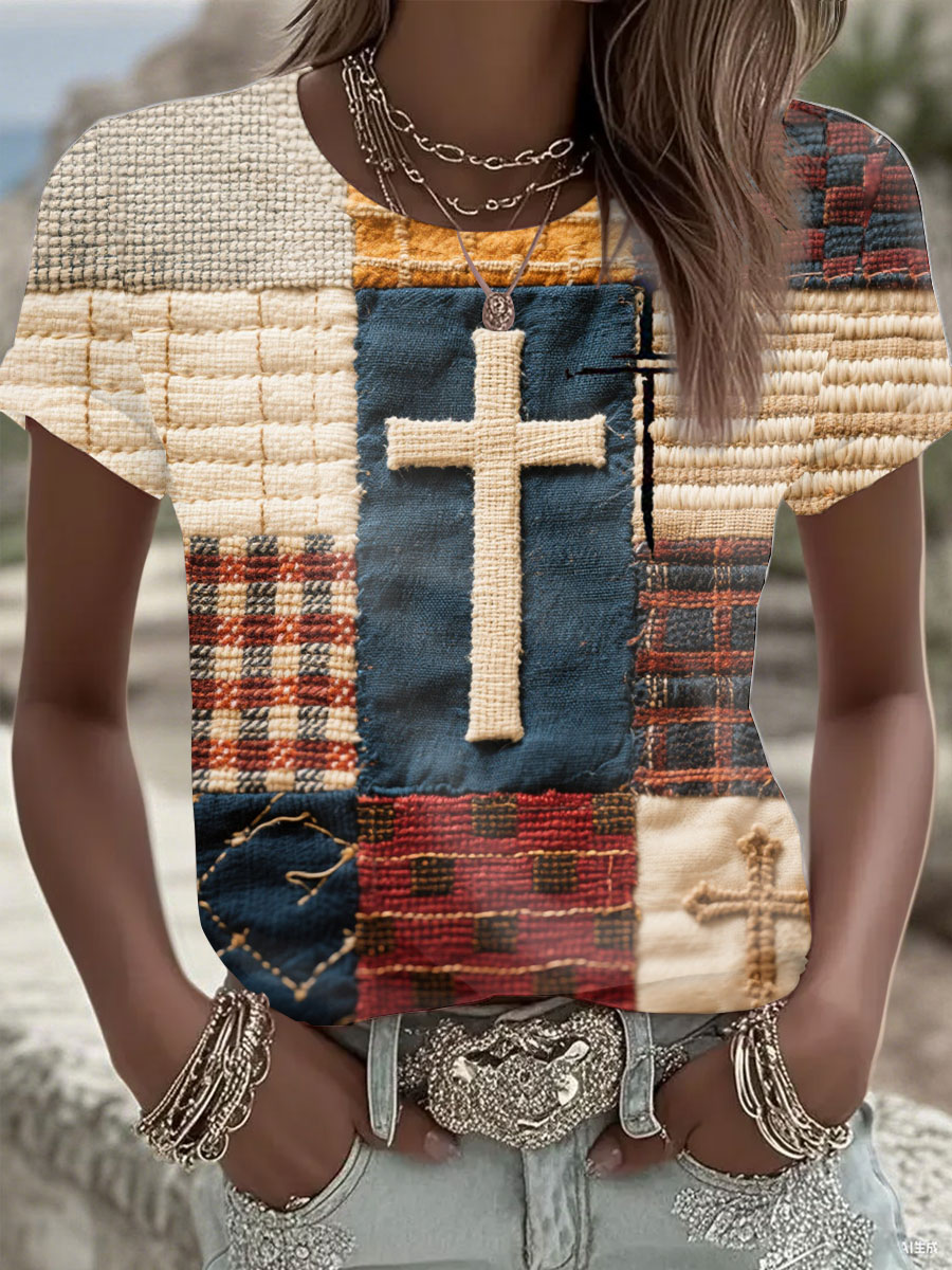 Women's Faith Patchwork Print V-Neck Ribbed Top