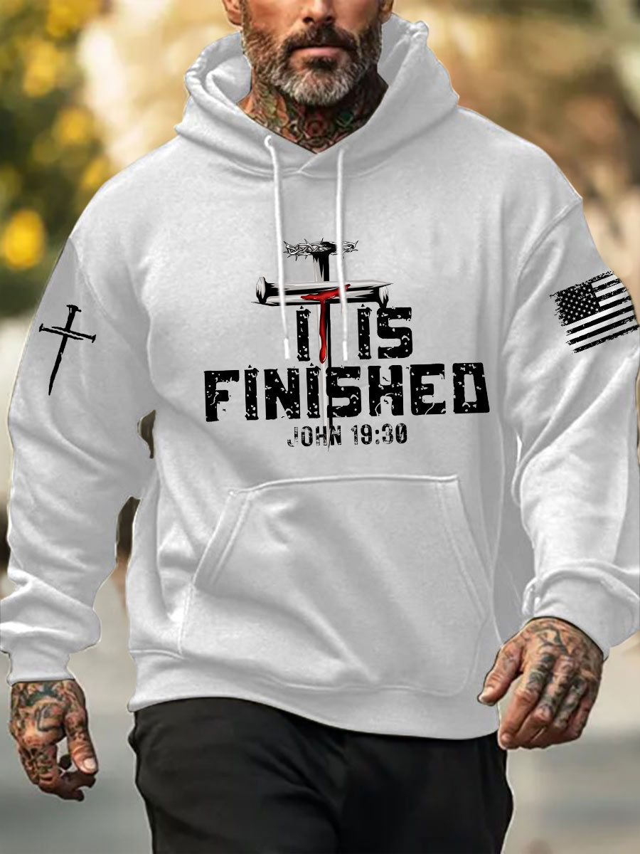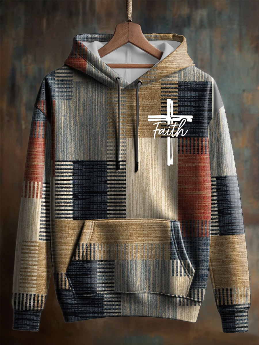 Men's Retro Casual Faith Cross Art Print Oversized Drop-Shoulder Pockets Hoodie