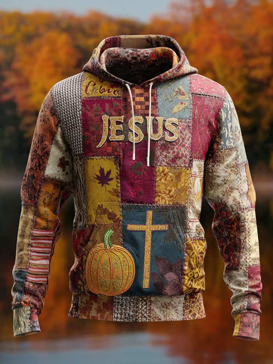 Men's Retro Casual Faith Cross Art Print Oversized Drop-Shoulder Pockets Hoodie