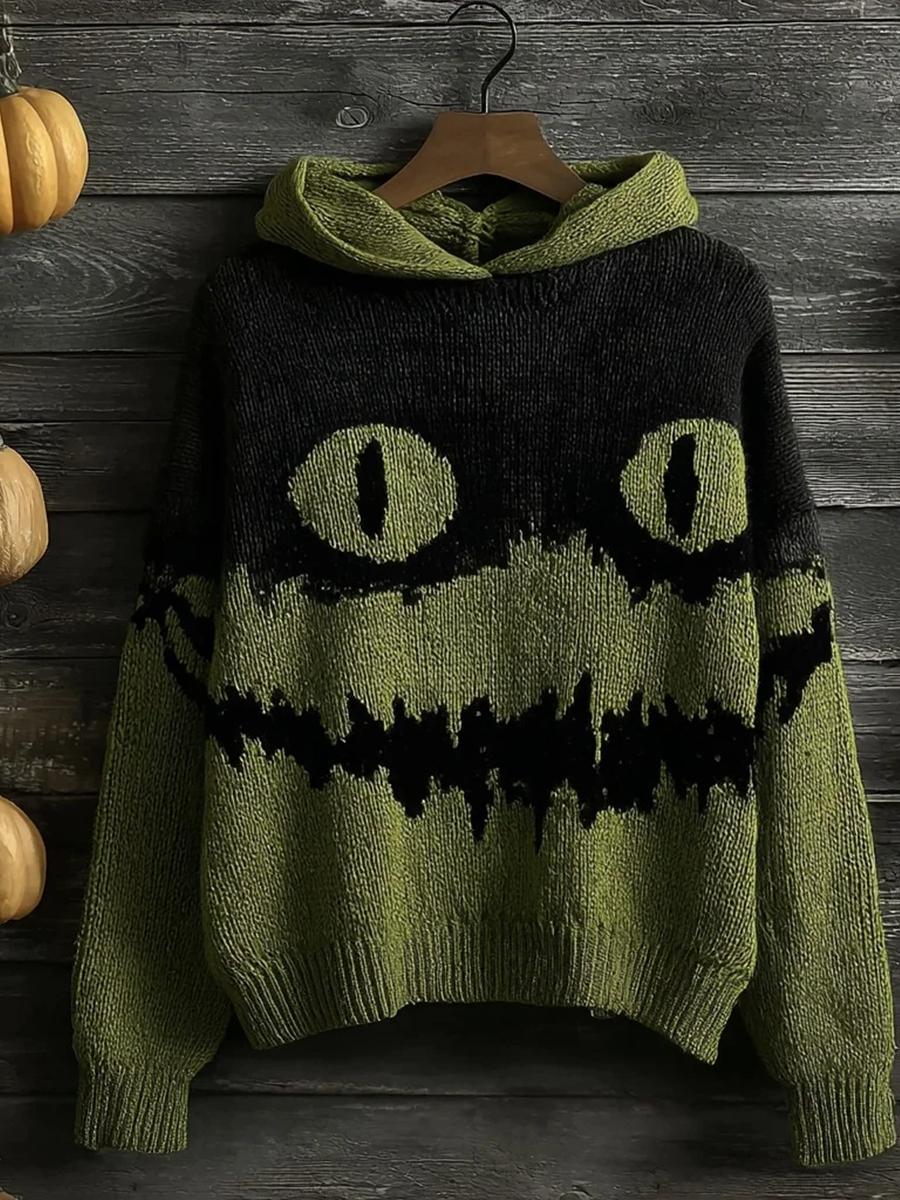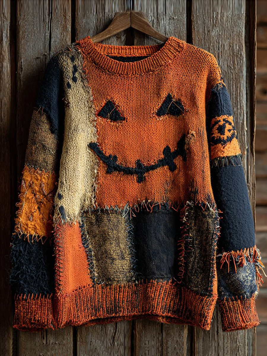 Men's Vintage Halloween Spooky Face Colorblock Crew Neck Sweatshirt