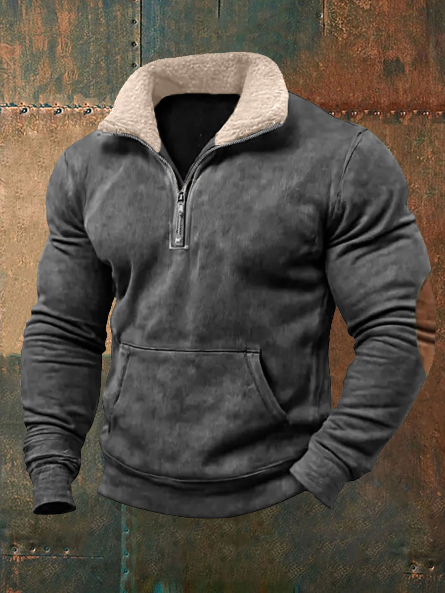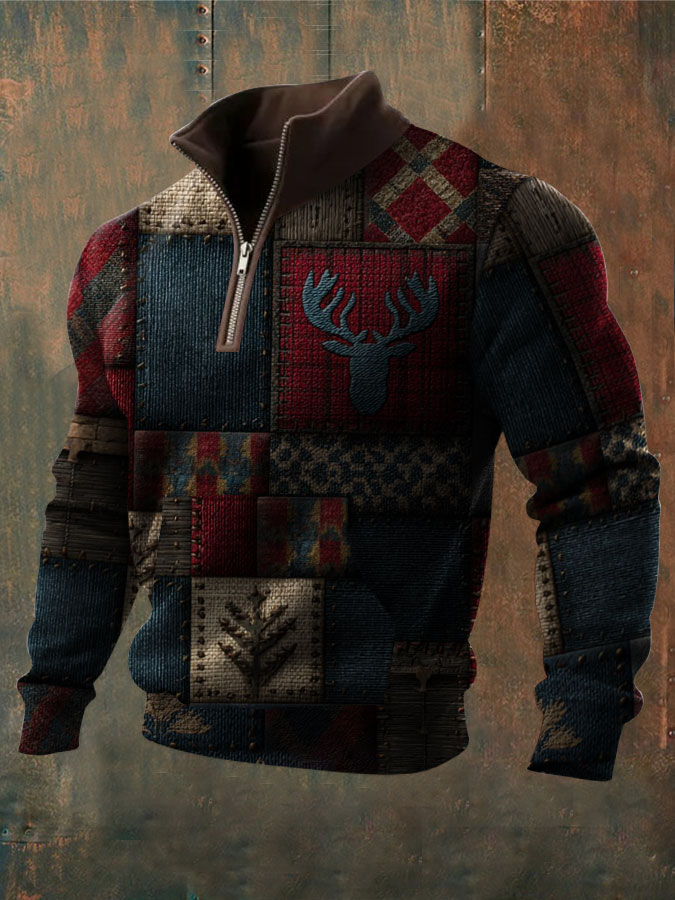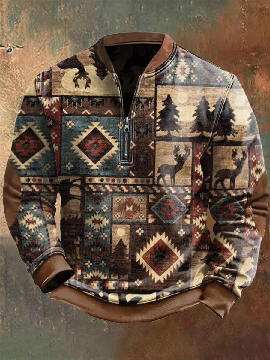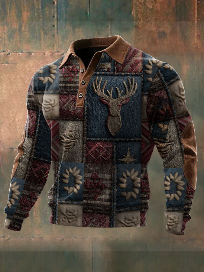 Men's Western Hunting Enthusiast Jacquard Herringbone Design Stand Collar Button Sweatshirt