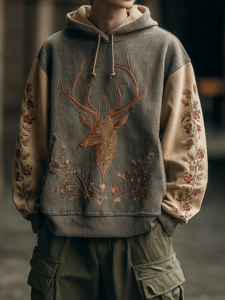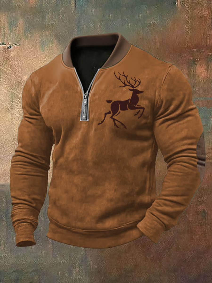 Men's Fleece Vintage Western Antler Hunting Enthusiast Stand Zipper Sweatshirt