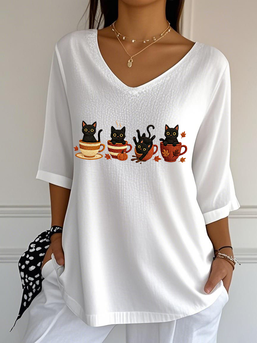 Women's Cute Autumn Black Cat Pumpkin Printed V-Neck Top