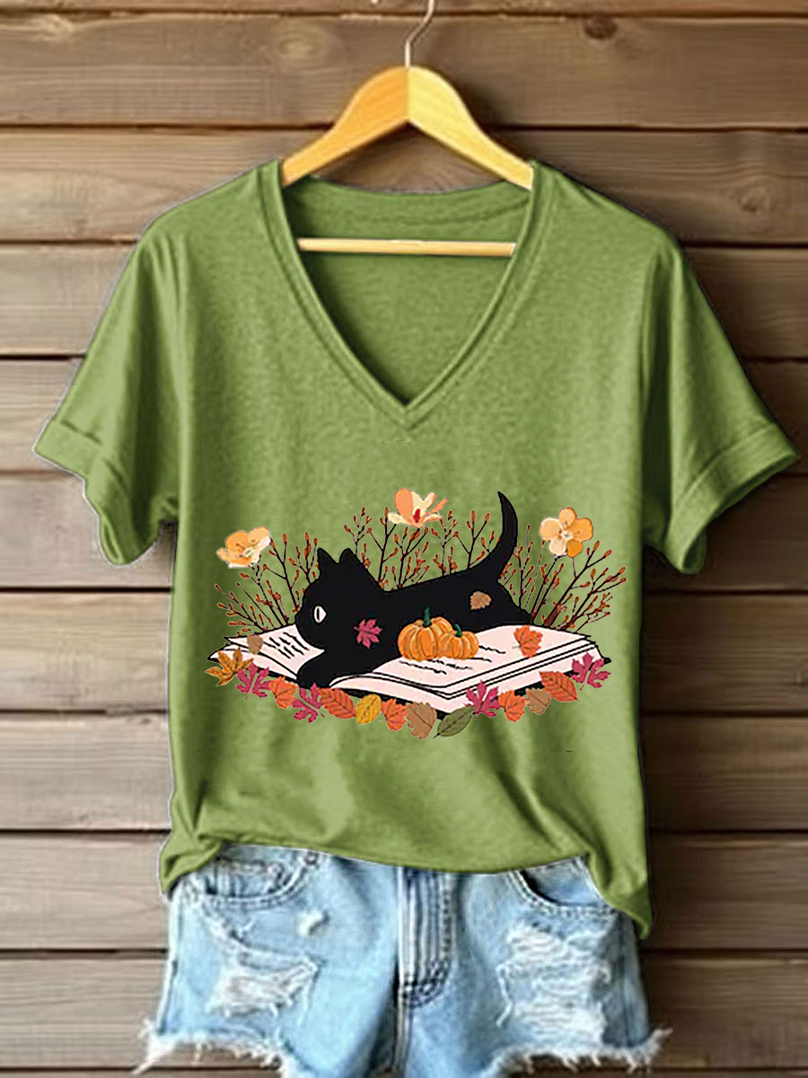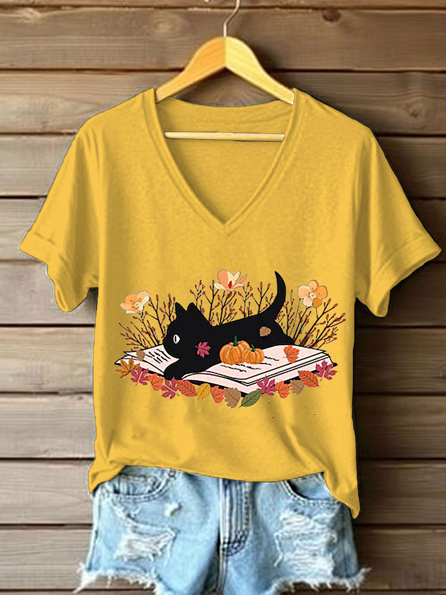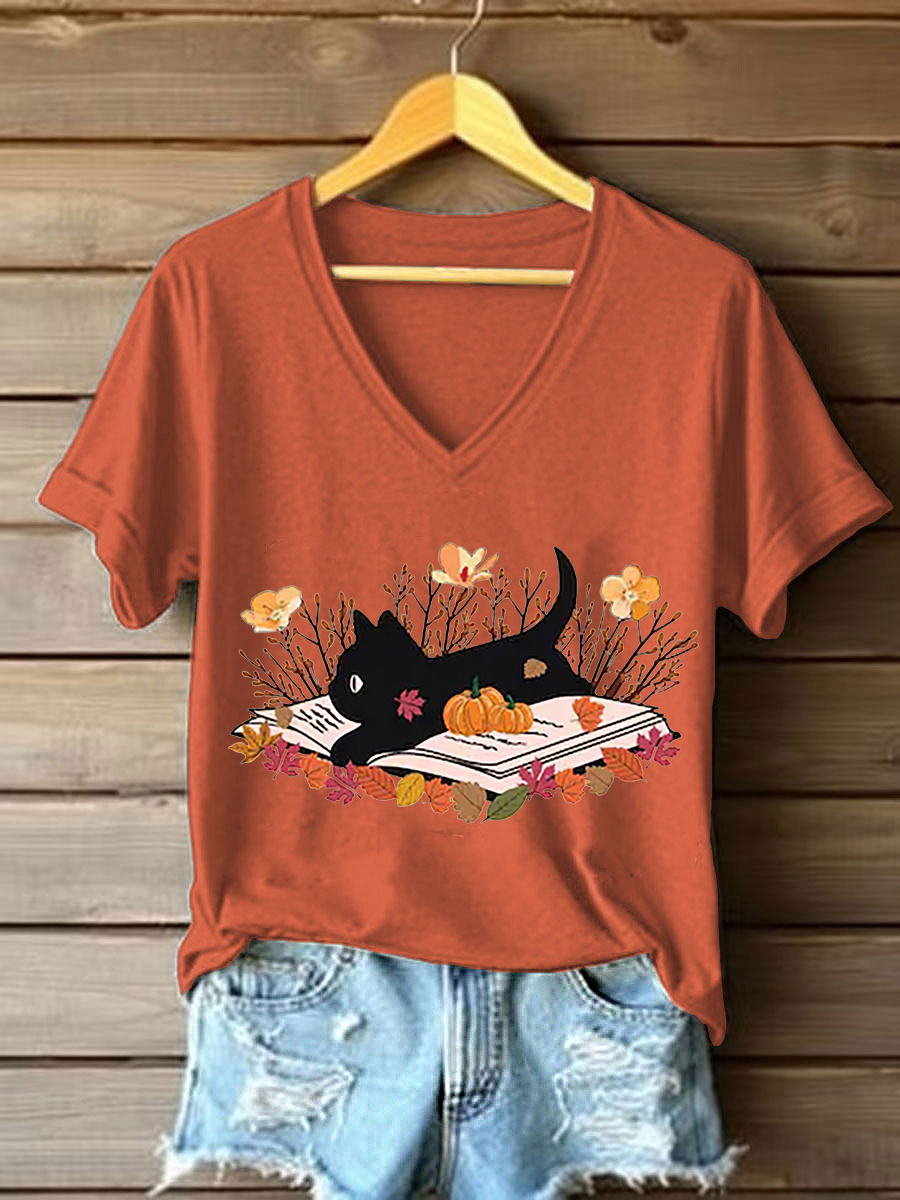 Women's Fall Cat Book Pumpkin Maple Leaves Short Sleeve T-Shirt