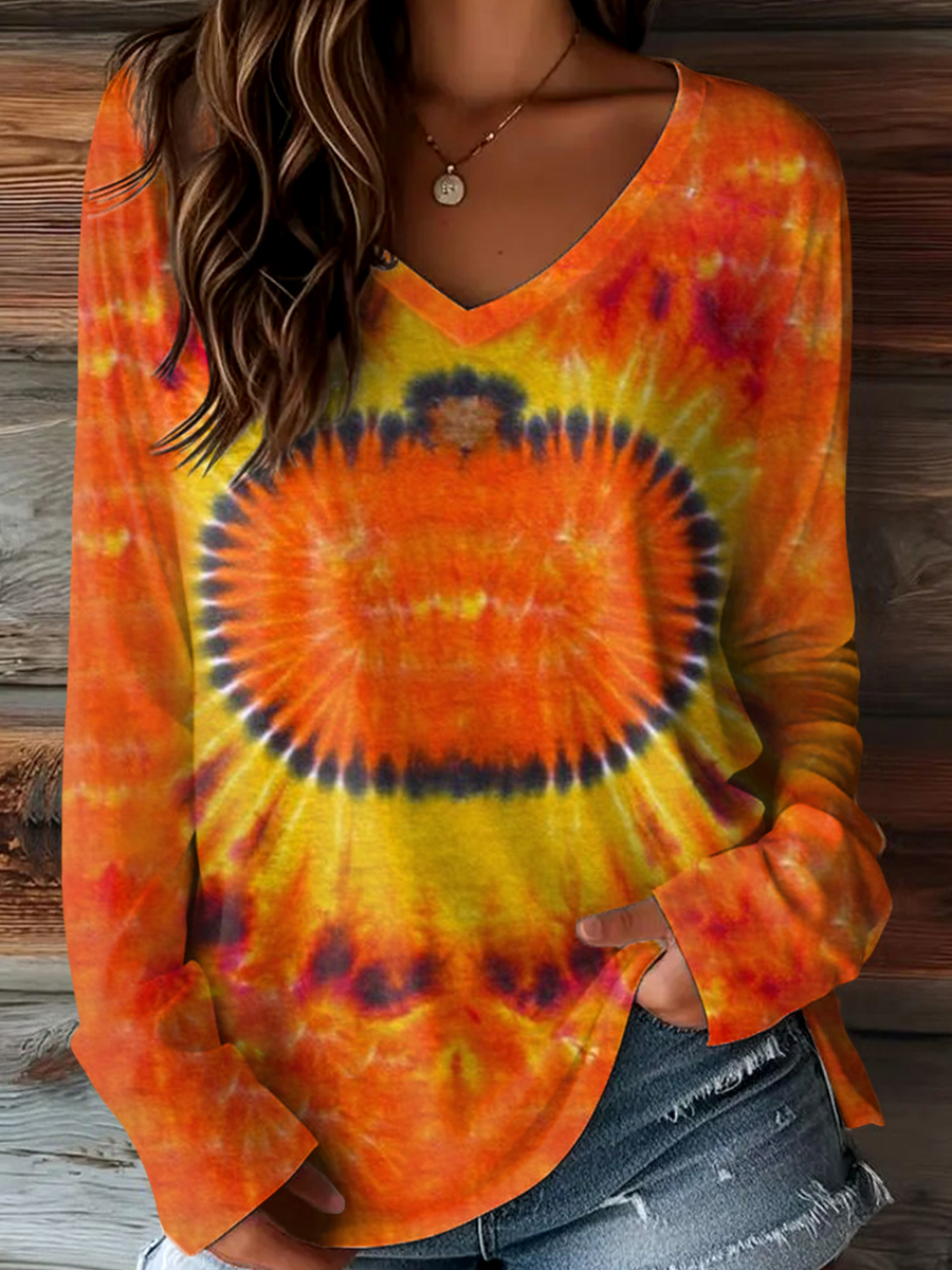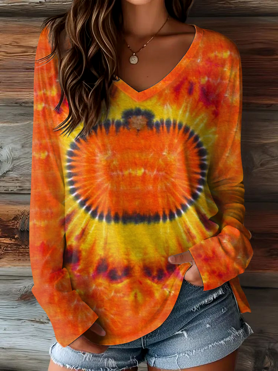 Women's Fall Tie-Dye Pumpkin Print Casual V-Neck Long Sleeve T-Shirt