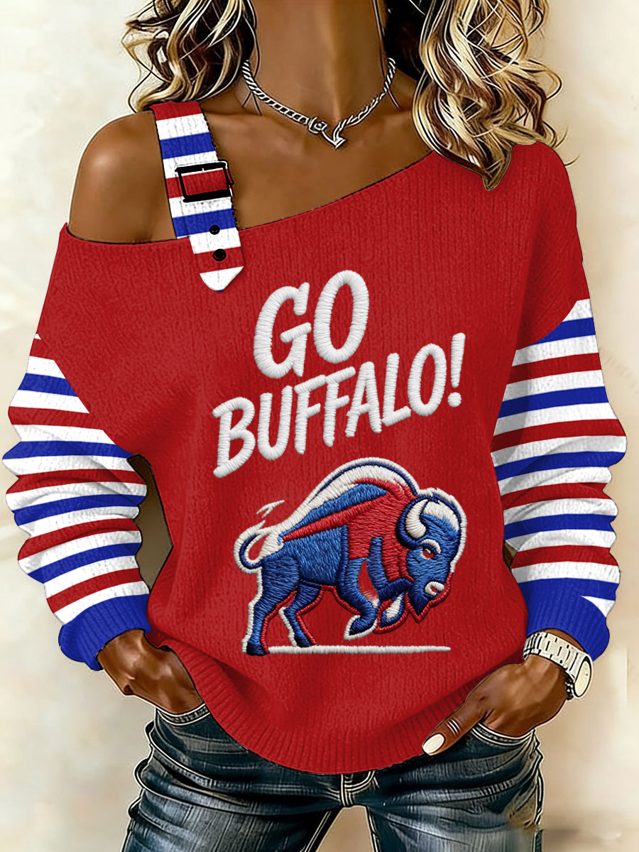 Women's Go Buffalo Stripes Print Football Fans Gameday Casual Off-Shoulder Top