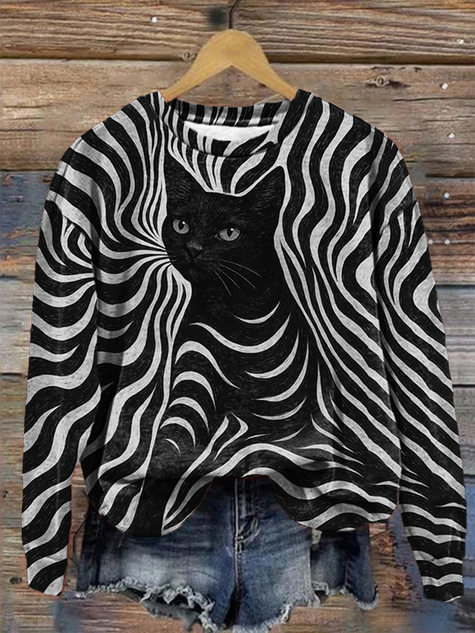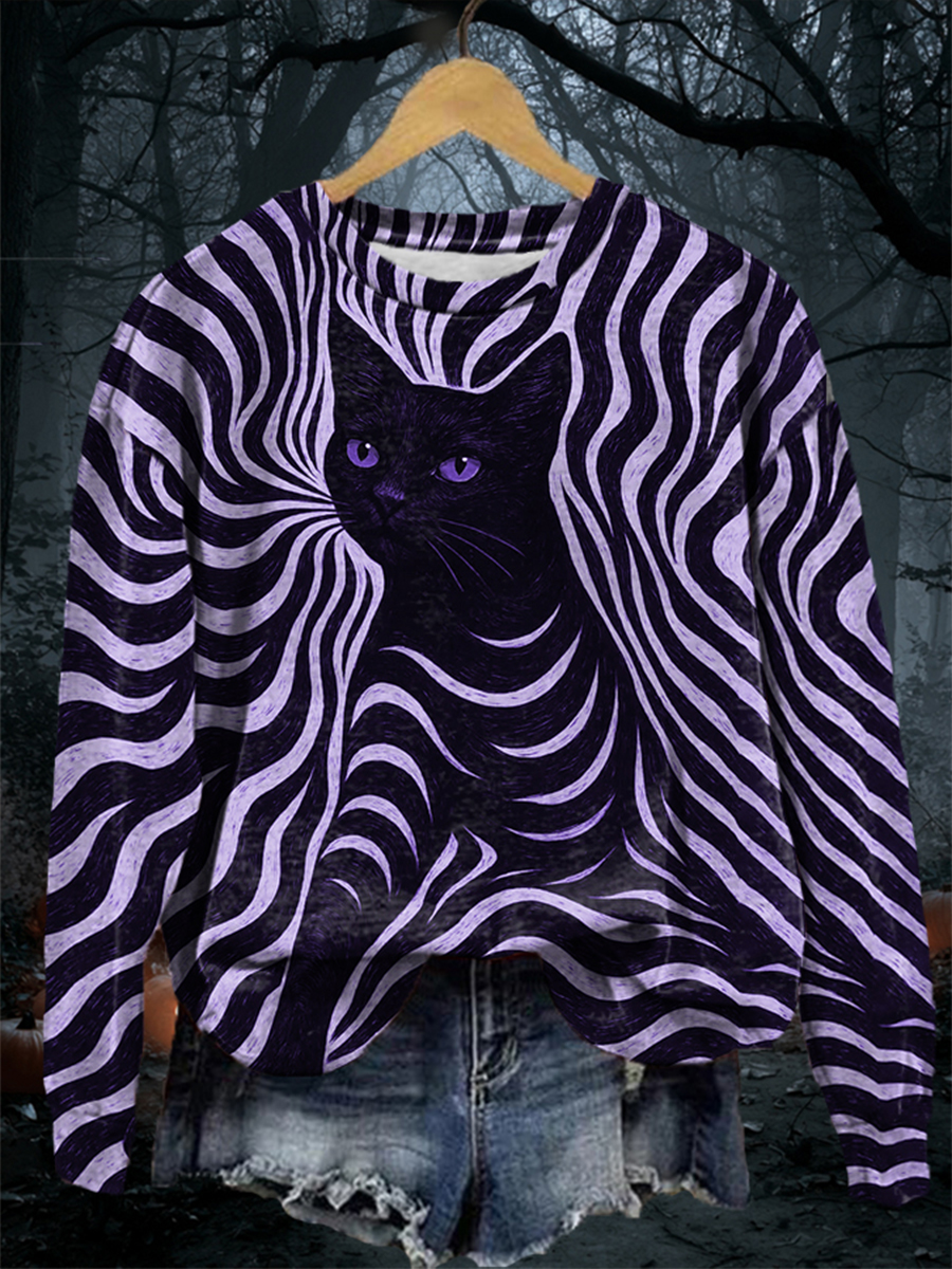 Women's Halloween Black Cat Stripes Print Casual Sweatshirt