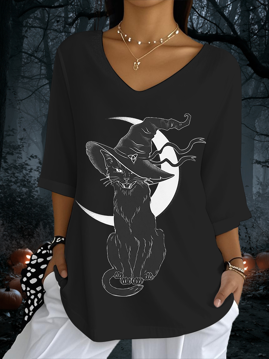 Women's Vintage Halloween Black Cat Witch Printed V-Neck Top