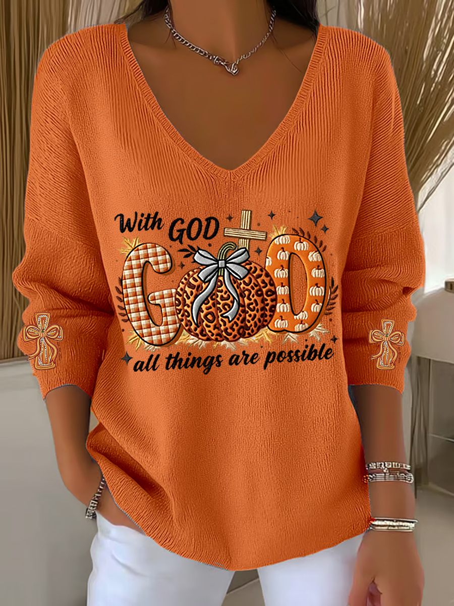 Women's With God Pumpkins Cross Printed V-Neck Top